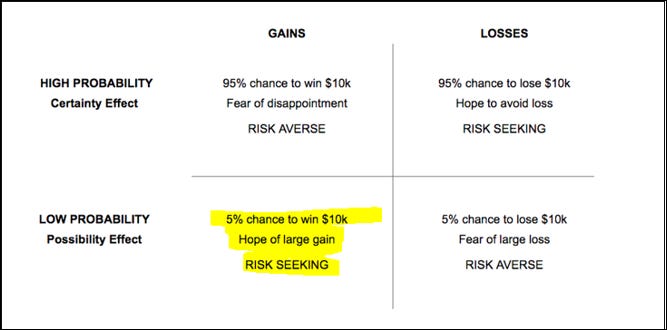 “The possibility effect in the bottom left cell explains why lotteries are popular. When the top prize is very large, ticket buyers appear indifferent to the fact that their chance of winning is minuscule. A lottery ticket is the ultimate example of the possibility effect. Without a ticket you cannot win, with a ticket you have a chance, and whether the chance is tiny or merely small matters little. Of course, what people acquire with a ticket is more than a chance to win; it is the right to dream pleasantly of winning.”