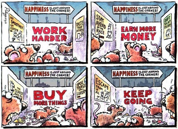 A sociedade vende-nos a fantasia de que um dos nossos propósitos (se não for O propósito) da nossa vida baseia-se na acumulação do máximo de bens materiais e de dinheiro. Esta ideia falaciosa e manipuladora acabou por se enraizar na sociedade ocidental de forma algo natural, visto que o consumismo é a âncora do nosso sistema económico. A ideia de que será um BMW, uma camisola da Gucci, ou uma mansão com 10 hectares, a chave para um orgasmo de felicidade, é a maior ilusão dos tempos modernos. E é nessa ilusão que muitos de nós vivemos, uma autêntica corrida de ratos onde caçamos objetos materiais, em vez daquilo que genuinamente desejamos, perdendo a nossa identidade pelo caminho. Extingue-se aquilo que nos faz únicos e humanos, tornando-nos autênticas máquinas programadas para satisfazer os interesses daquilo que outros ditam como sendo o melhor para nós. A equação da felicidade não é fácil de se resolver, no entanto sabemos que a variável dos bens materiais não é de todo a solução.